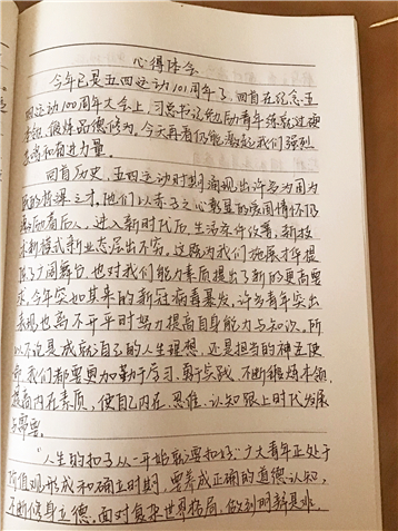 焕发青春活力,展现青年光彩—— 党支部利用“学习强国”学习平台,认真学习习近平总书记在纪念五四运动100周年大会上的重要讲话,大家记录并分享自己的感悟体会。“五四不仅是一种运动,更是一种精神。”正如学生党员韩璐瑶心得体会所言:疫情期间对五四精神理解更加深刻,在今后更要发挥自己所有力量,甘于奉献,承担青年的使命责任。