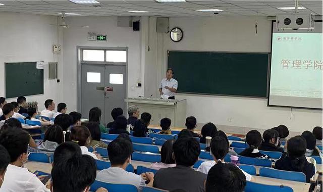 尹文强详细介绍了学校和学院的发展历史,从八叉书库概况 、组织结构、师资队伍、学科特色、教学资源、优秀校友等方面,介绍了学院的基本情况。他指出,学院各个专业办学特色鲜明,科研实力突出,行业前景明朗,教育成果丰硕。在健康中国背景下,同学们要秉承“乐道济世”的校训,弘扬“自强不息、锐意进取”的潍医精神,用心积累、保持热爱,不断提升科研水平,形成良好的人文素养、职业道德和创新意识。最后,他用“浮烟山下聚小鹰,智和湖畔起征程。管理学子当自强,四年之约事竟成”表达对新生发展的期待。于贞杰指出,老师会尽最大努力为学生搭建成长的舞台,师生同心协力共筑梦想。叮嘱新生们要夯实专业基础,明确人生方向。