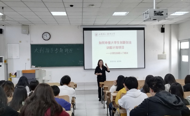 胡善菊老师从项目简介、申报流程、申报技巧、评审重点、注意事项等方面依次进行了详细解读,并以创新训练类、创业训练类项目为主,向大家展示了往届优秀项目成果,供同学们学习和借鉴。在这过程中,胡老师提醒大家,在申报项目时一定要有清晰的方向和目标,制定并落实好实施计划,并注意与“互联网+”、“挑战杯”等高级别创新创业赛事、本科毕业论文、案例大赛、调研山东等相关项目的有效衔接,提高项目立项和经费使用的效率。最后,胡老师和与会的董毅老师、邢洁老师一起,对大家表达了殷切期望,希望同学们通过各种机会锻炼自己,有更多同学参与到大创项目申报中来。
